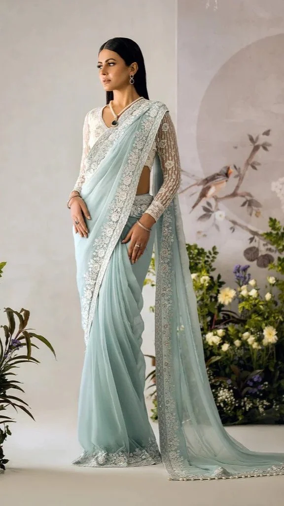 A Sari is a piece of often brightly coloured, frequently embroidered fabric five to seven yards long. It is worn over the body as a robe, with one end attached to the waist, while the other end rests over one shoulder as a stole. Nowadays it is worn over a petticoat or a blouse. Draping a sari is not straightforward and will be difficult if you’re not with someone experienced in doing so.